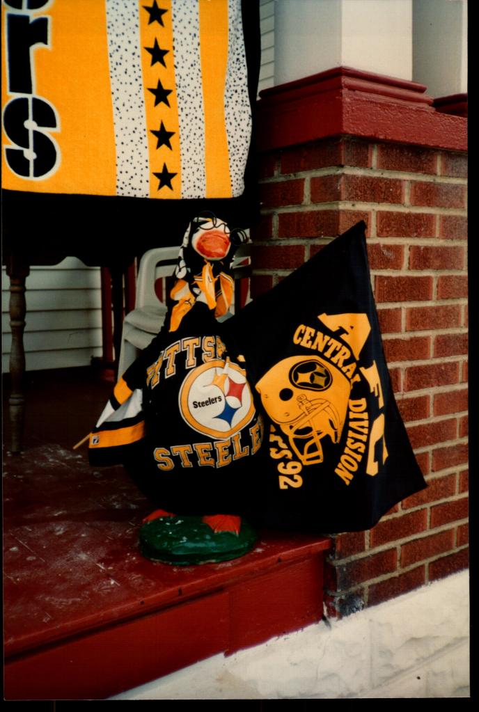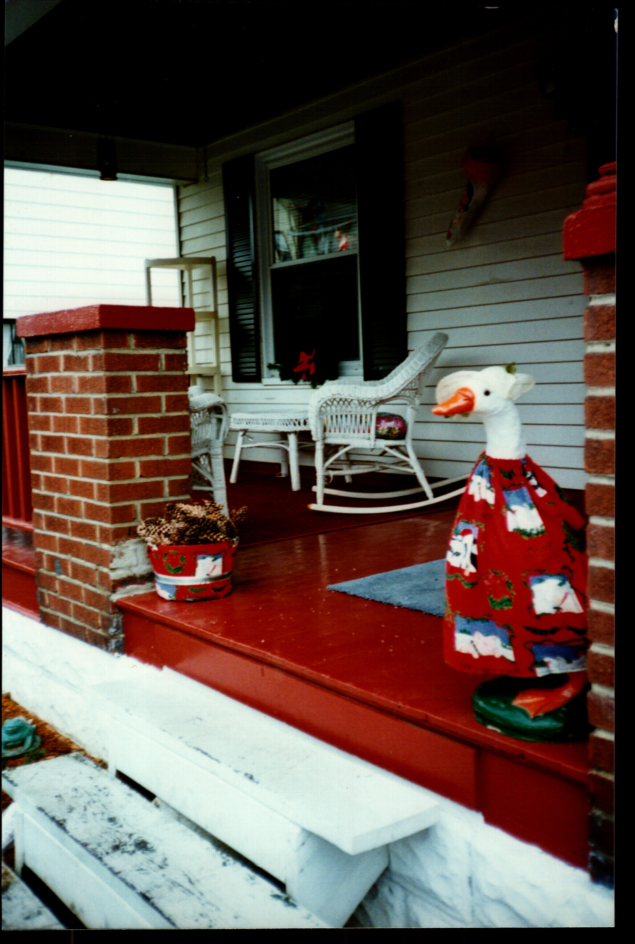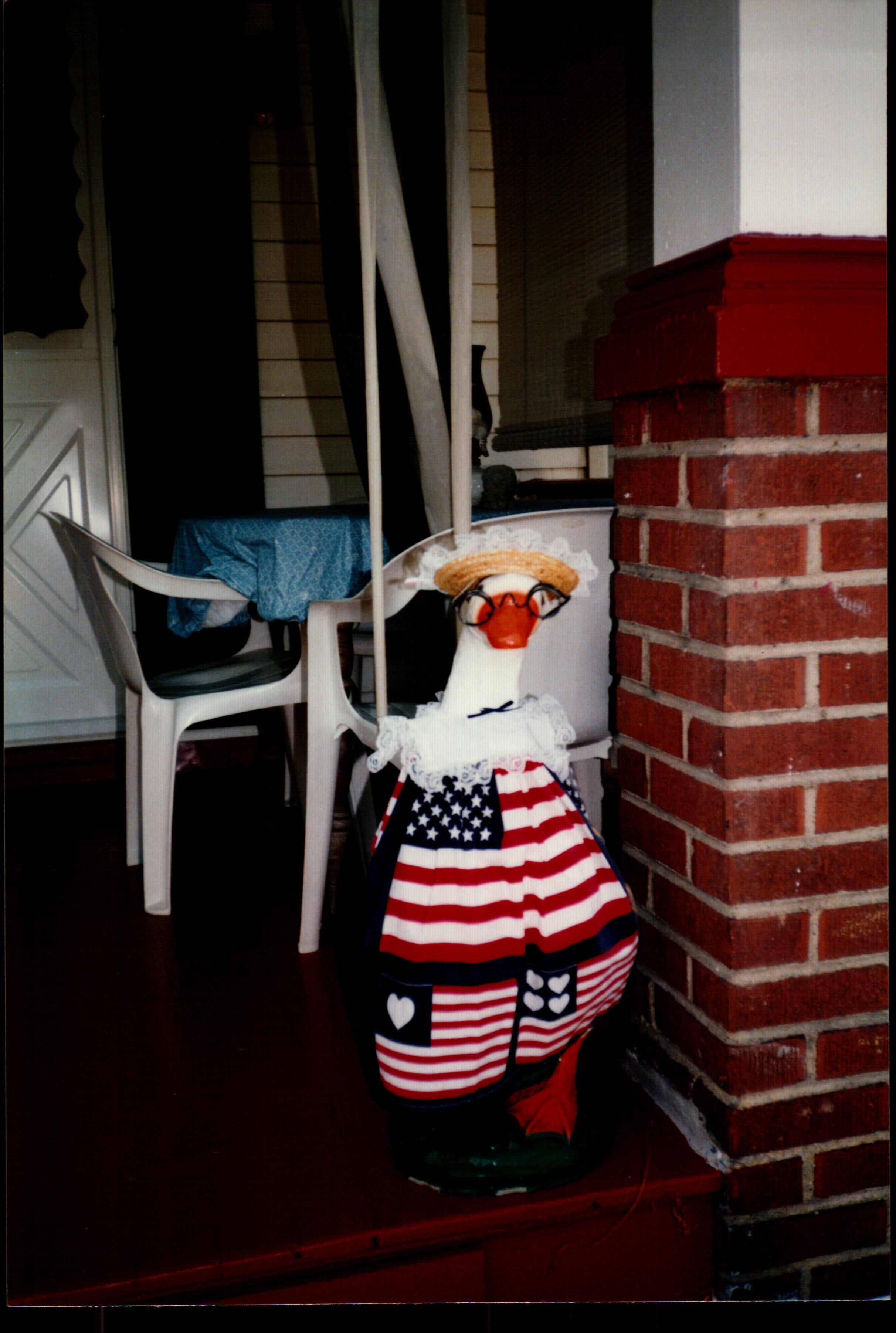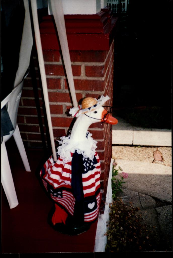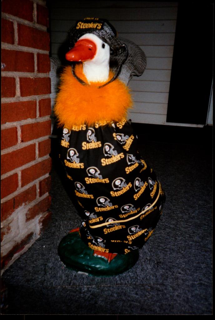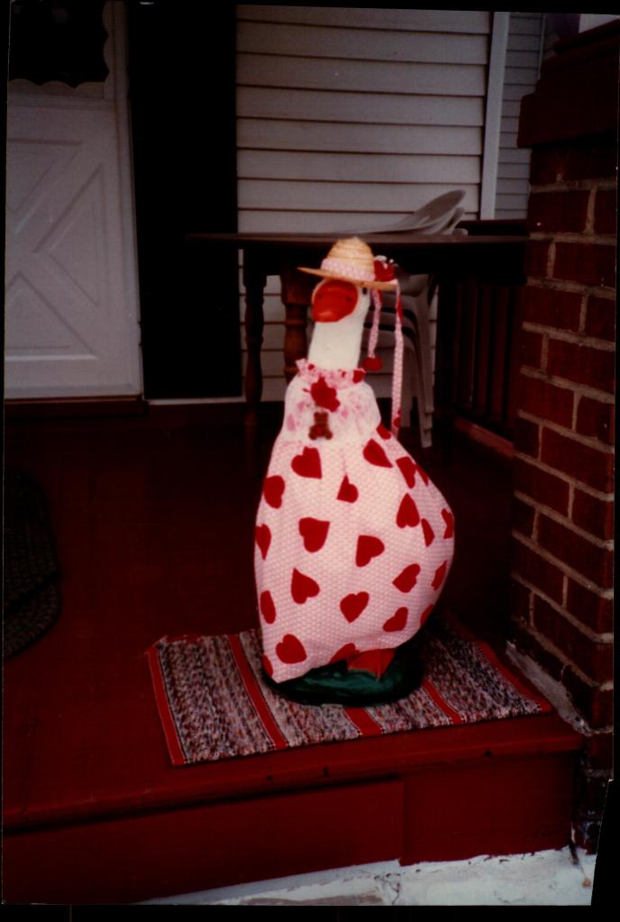 My mother had a cement goose figurine that she dressed up in costume corresponding to whatever time of year it was. Holidays, fall, Easter, etc. Here are some pictures.