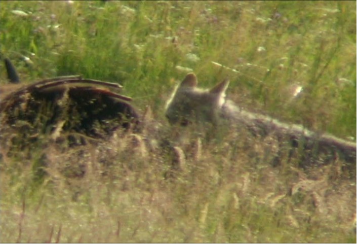 I was leaving the Hayden Valley planning to hang out at Gibbons Meadow on my way to West Yellowstone. As I came across Otter Creek two photographers were standing there with scopes so I asked them what they were looking at. There was a bison carcass about sixty yards from the road that a coyote was feeding on earlier. I stopped to check it out hoping, like them that a wolf or grizzly would show up to feed off it too. Eventually they both had to leave but I hung around since this is what I planned to do at Gibbons Meadow anyway. Around seven a the coyote came back