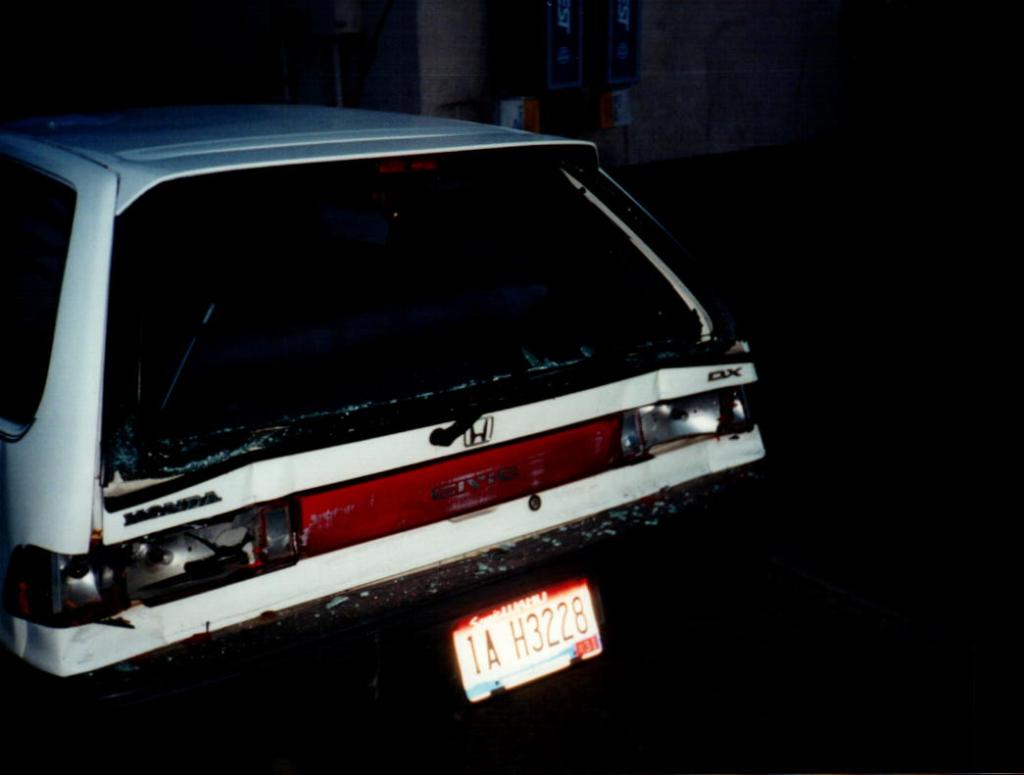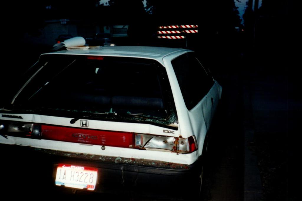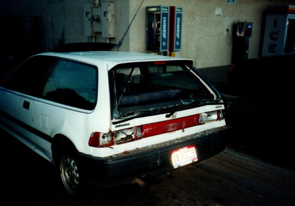 Her Jeep had no damage. It has one of those rambar things on it. The back end of mine was smashed and undrivable. The Jeep driver got a ticket for inattentive driving and I had to by a new car. This really pissed me off. I loved that Civic. It was small but had a hatch which increased storage space. I drove it across country without any problem. The gas mileage was over 40mpg combined. And it was paid for. My insurance company paid for a rental car while I looked for a new car. This took a month because I loved the car they gave me, a Ford Escort. I talked to a lawyer about suing the other driver because now I was going to have a car payment I didn’t want. He said sorry but this was one of those occasions where I had to take the hit and move on.