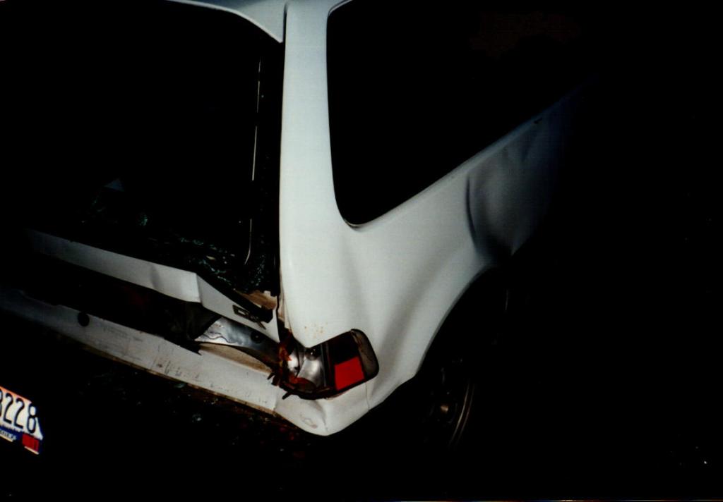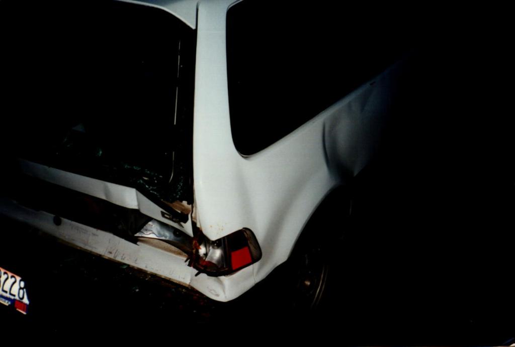 Bottom photos: Boise, ID. I was out driving and came to a four-way intersection with stoplights in all directions. My side of the intersection had four lanes. Two for straight ahead and two for left turns. I was in a lane to go straight and the first or second car at the light. The two lanes to my left were for turning left and had their own lights with the left-turn arrow. The woman in the white jeep was behind me but stopped about thirty feet behind me. I don’t know why. The left turn lights turned green. Seeing the left turn arrows turn green caused me to take my foot off my brake, drift for a foot or two then stop again. Next thing I know this Jeep hits me hard. My guess is that the driver also saw the left turn arrows turn green and assuming it was her light that was green, floored it.